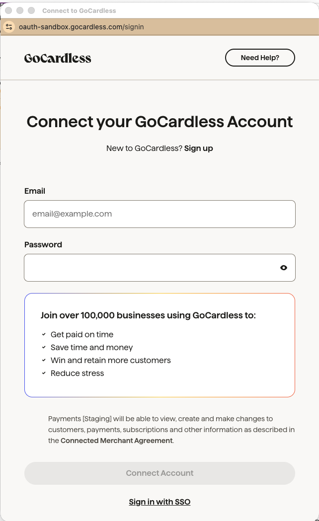 Connecting to GoCardless is an OAUTH process, this requires you to log into GoCardless, which then shares a security token with us. To complete this you need a GoCardless login with administrator access on your GoCardless account.