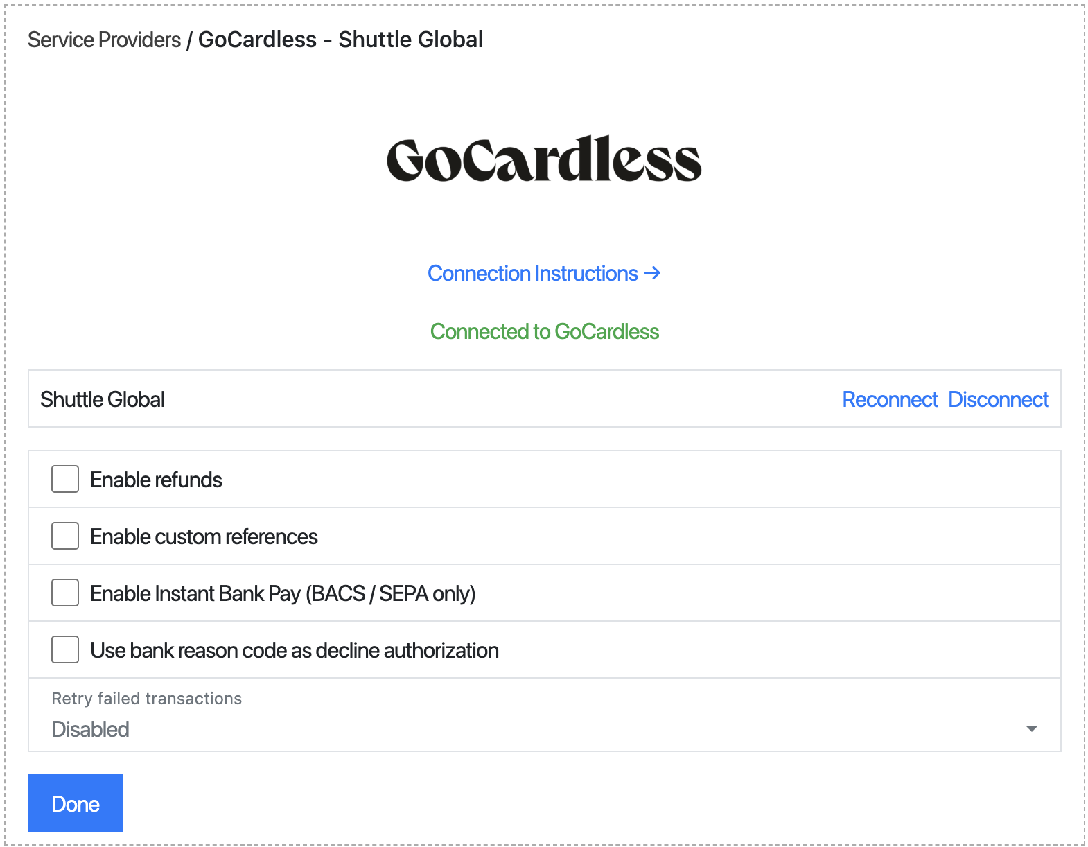 3. After login you will be returned to a configuration screen, the connection will be tested and you will be presented a green “Connected to GoCardless” message, if there is an error with the connection, check the account details are correct and you have granted the user all permissions.