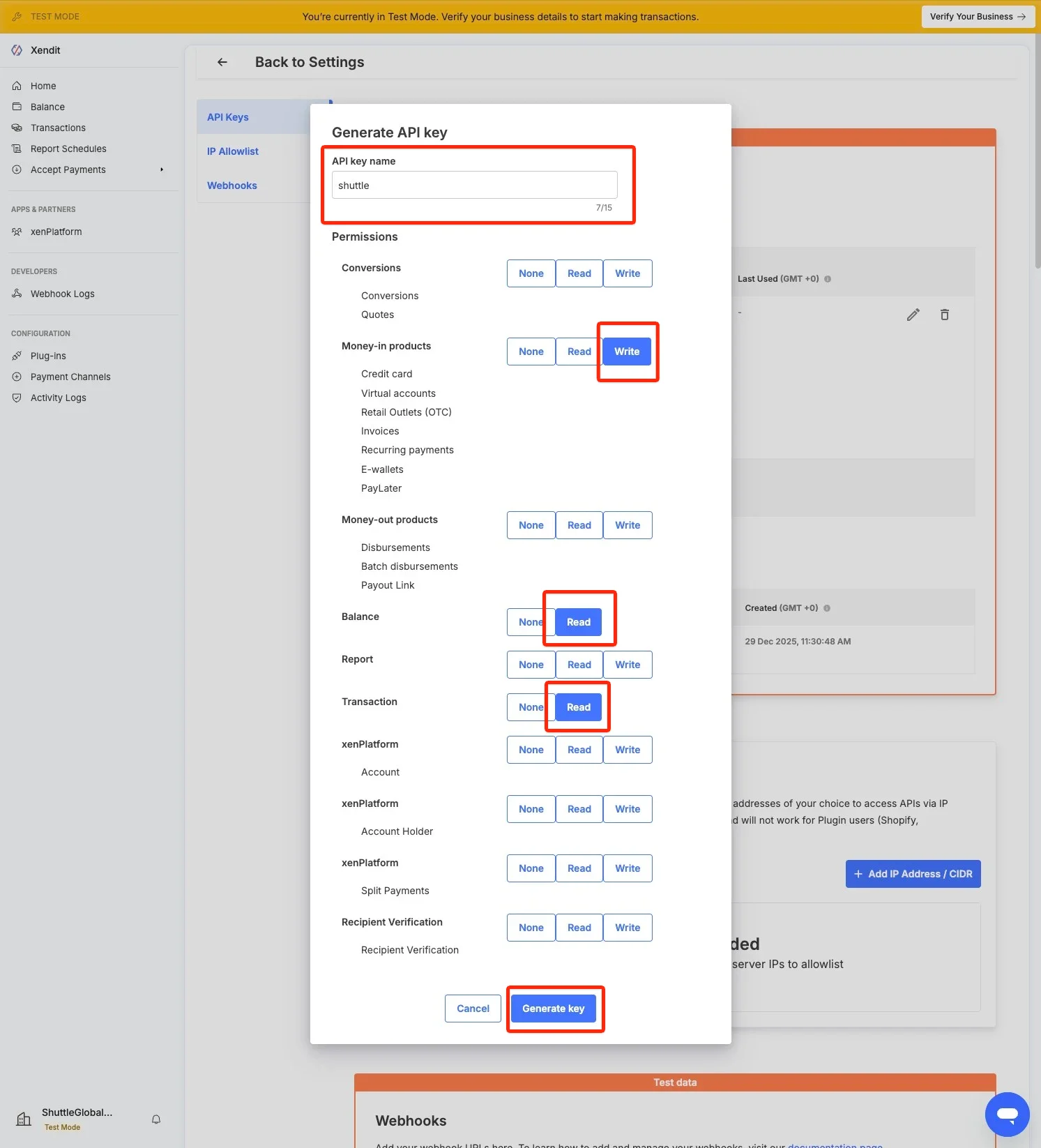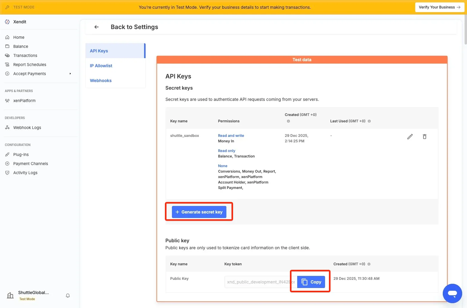 5. In Shuttle enter the “Secret API Key”, “Public API Key”, and “Webhook Verification Token”, select your country and click “Save”