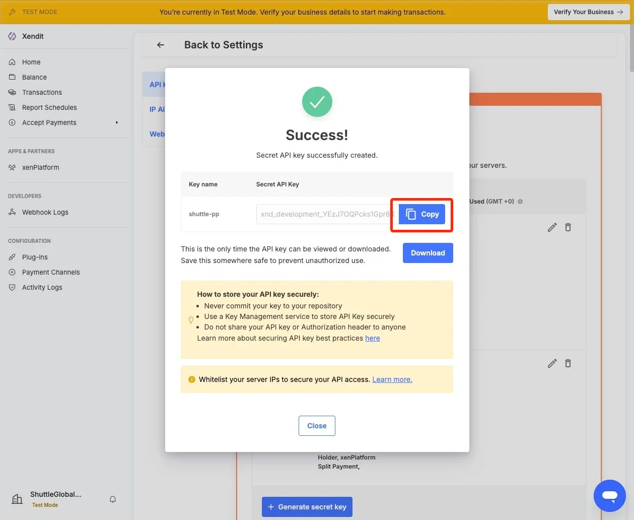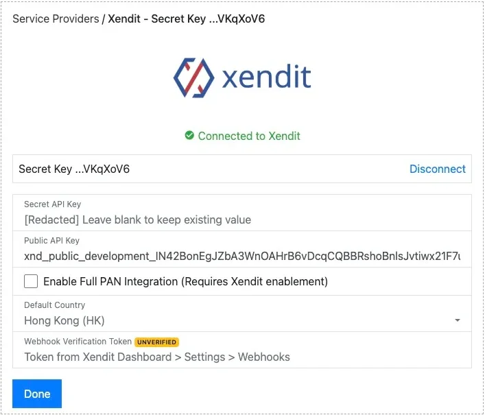 6. Once connected, you will be presented a green “Connected to Xendit” message, the API Key will not be displayed.
