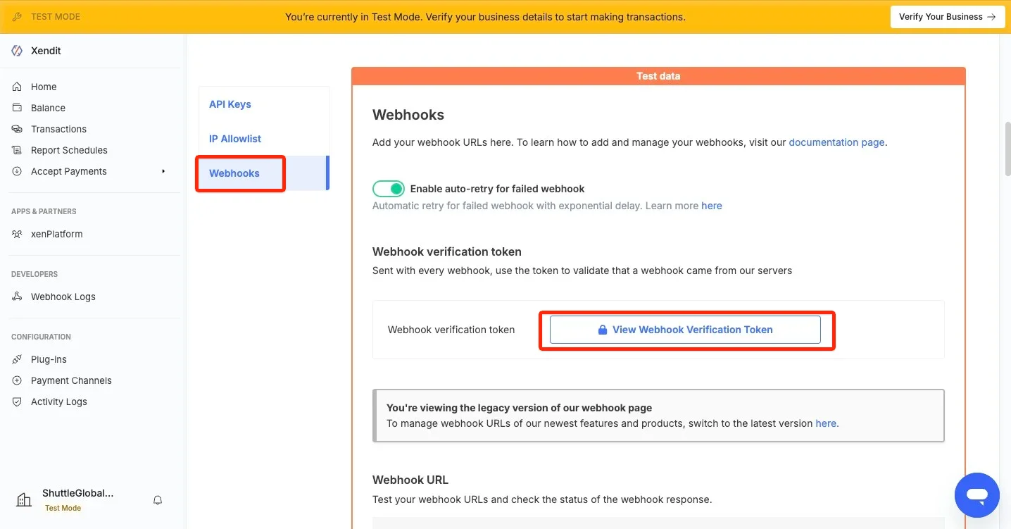 7. To complete configuration ensure your webhooks are configured correctly, by performing a test payment, if you have configured webhooks correctly, you will receive a green “VERIFIED” badge.